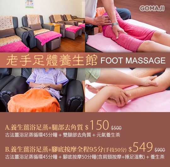 老練手法、精湛力道!【老手足體養生館】專業技術為你深層按摩!紓解緊繃壓力、還有雙腿去角質嫩膚課程,重新擁有煥然一心的舒暢活力!